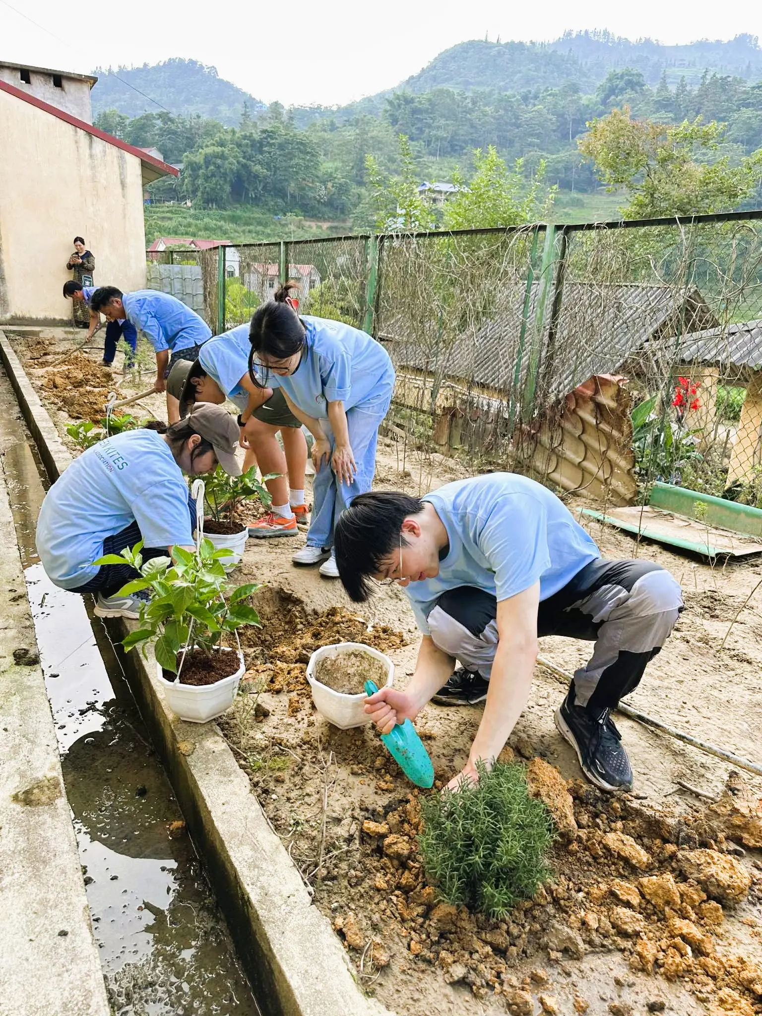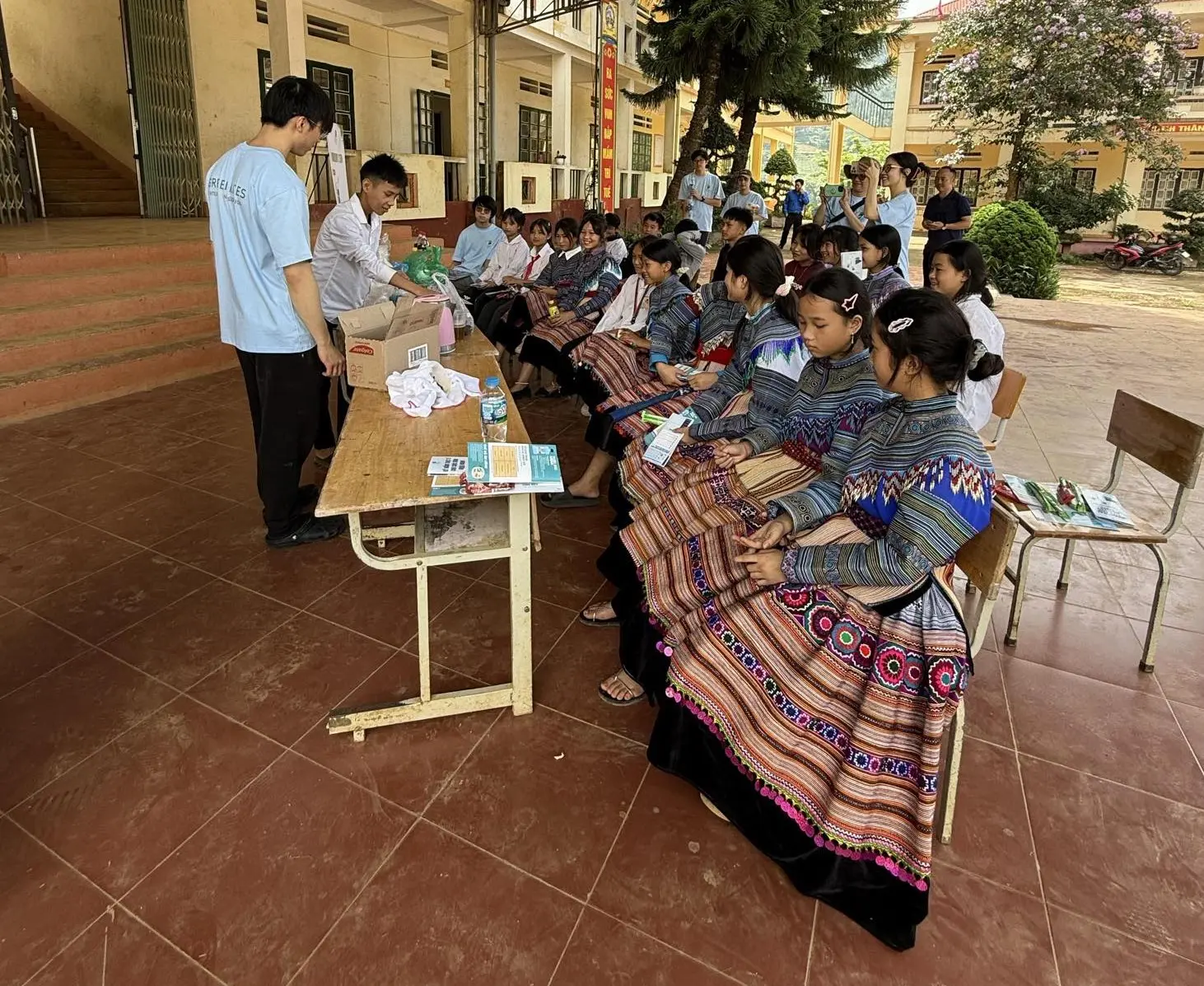 Recognising that most households relied on rainwater but lacked guttering systems, we designed a simple, low-cost rooftop rainwater harvesting system tailored to local materials and terrain. We installed gutters, water tanks, and sinks. To further improve hygiene, we planted insect-repellent bushes, introduced handwashing education through songs and activities, and guided students in making natural soap from local herbs.